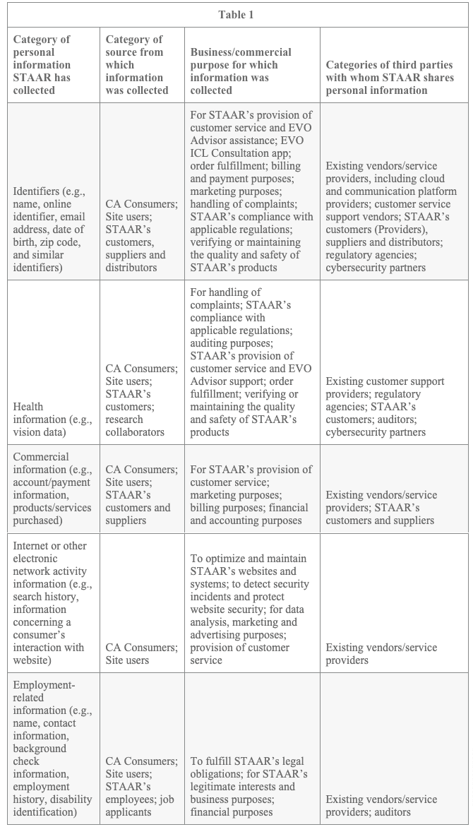 Table 1 describes the categories of CA Consumers’ personal information STAAR has collected in the last 12 months, categories of sources from which that information was collected, the business or commercial purpose for which the information was collected, and the categories of third parties with whom STAAR shares such personal information: